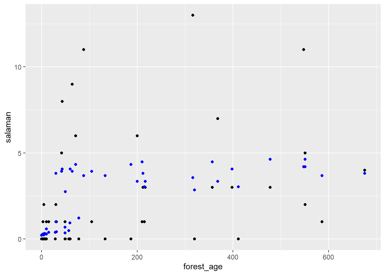 geom_point(aes(y = fitted(mod_sal)), color = "blue")