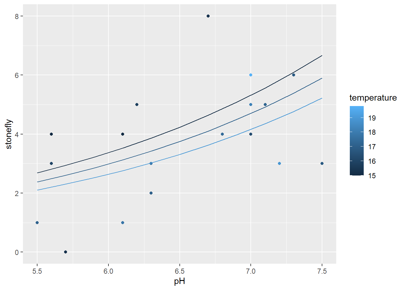 ## glm(formula = mayfly ~ temperature + pH, family = poisson, data = stream)